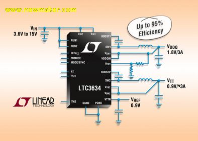 凌力爾特公司 (Linear Technology Corporation) 推出高效率、雙通道單片同步降壓型穩(wěn)壓器LTC3634,該器件為DDR1、DDR2和DDR3 SDRAM控制器提供電源和總線終端軌。LTC3634 在3.6V至15V的輸入電壓范圍內(nèi)工作,從而非常適用于雙節(jié)鋰離子電池應(yīng)用以及5V和12V中間總線系統(tǒng)。LTC3634采用獨(dú)特的恒定頻率/受控接通時間、電流模式架構(gòu),這種架構(gòu)非常適用于從一個12V輸入電源以高開關(guān)頻率給DDR應(yīng)用供電。其終端電壓VTT設(shè)定為VDDQ的1/2,可低至0.6V,準(zhǔn)確度為±1.6%。單片設(shè)計和高達(dá)4MHz的開關(guān)頻率相結(jié)合,允許使用纖巧、低成本電容器和電感器,可為DDR電源應(yīng)用提供一種非常緊湊和高效率的解決方案。