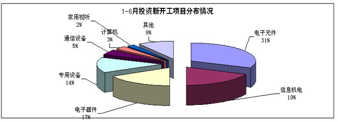 上半年,電子信息產業新開工項目3693個,扭轉去年同期負增長局面,同比增長62.6%。其中,電子元件、信息機電和信息化學品等領域新開工項目增長最快,增速分別達67.2% 、82.5%和154.2%。