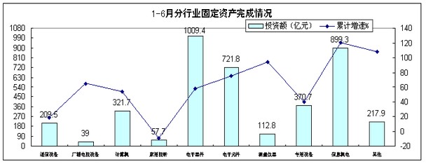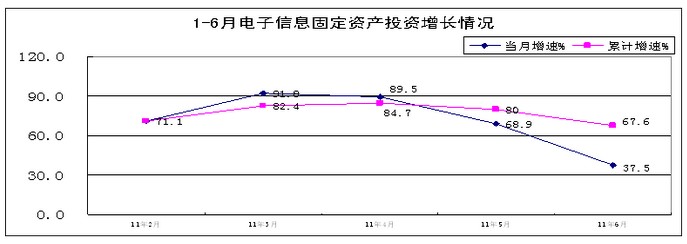 上半年,電子信息產業500萬元以上項目完成投資3960億元,規模接近去年前三季度水平,同比增長67.6%,高于去年同期26.6個百分點,高于同期工業投資40.7個百分點。自二季度起,投資增速高位回落,6月份增速(37.5%)比4、5月份分別回落52和31.4個百分點。