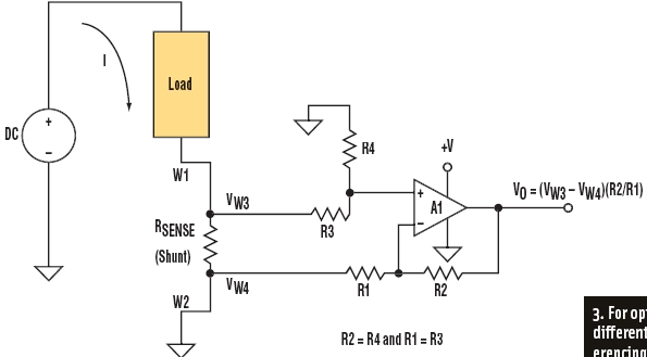 為避免引入這樣的誤差,需要進一步增加兩個措施:采用開爾文連接方式與分流電阻相連并加入一個差分輸入放大器。開爾文連接是一種帶有兩條激勵引線和兩條傳感引線的4線連接(圖2)。其中兩條線(W1和W2)是激勵引線,它們將分流電阻連接到該電路的大電流端。另外兩條線(W3和W4)為傳感引線,它們將分流電阻兩端的電壓連接到放大器。這個方式將攜帶負載電流的導(dǎo)線與測量電路分離開來,并把W1和W2中的電壓降從分流電阻兩端的電壓測量中清除。為了進一步有效利用開爾文連接的優(yōu)點,還需加入一個差分放大器(如圖3)。