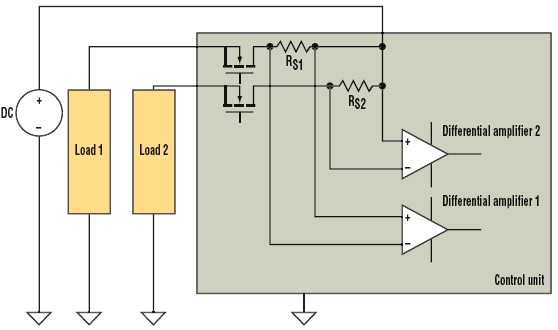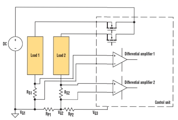 與圖1中一樣,流過每個負載的電流均為10A,分流電阻RS1和RS2均為0.025 Ω。流過控制單元的電流為1A。當(dāng)負載2運行時,在點VG2點的電壓比VG1點的電壓高2V (0.2 Ωx10 A = 2 V),VG3比VG2高0.2V。因而,相對于在該控制單元的共同連接點,差動放大器1的輸入電壓為-2.2V,高于大多數(shù)放大器的負共模電壓極限。除非該差分放大器所使用的放大器針對負共模電壓而進行了特殊的設(shè)計,否則,該放大器在這個電路中將無法正常工作。對于本例而言,低端傳感還有一個缺點是需要用導(dǎo)線將分流電阻和差動放大器輸入連接起來。