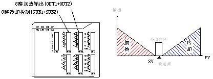 DTE10T在擴展輸出模塊后,SUB1輸出口可定義為冷卻輸出控制。利用雙PID計算,在溫度沒有沖過設(shè)定值時,溫控器就可提前啟動冷卻風(fēng)機,避免了溫度從高不下的情,并能保持溫度穩(wěn)定性。個人認為報警驅(qū)動的冷卻模式總將由于控溫不穩(wěn)定等原因被淘汰。雙PID控制方式必定是追求更高控溫精度的首選。如圖5所示。