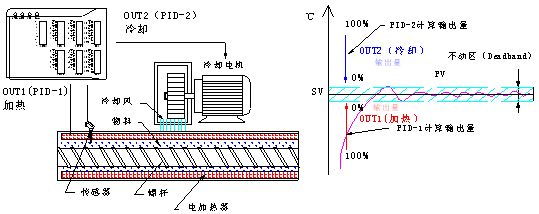 DTE不僅帶來了操作界面的變革,它提供的雙PID控制方式(雙向控制)更能為擠出機控溫效果帶來提升。所謂雙向控制,就是溫控器提供兩組輸出,一組為加熱,另一組為冷卻。在兩組輸出交替或共同運行的情況下很好的穩(wěn)定控制溫度。在某些有自發(fā)熱的情況下,能很好的應(yīng)用。擠出機在擠出物料時由于摩擦原因,自發(fā)的熱量不容小視。雖然在擠出的開始需要電熱器大量熱量補給,但是隨著不斷的擠出。摩擦生成的熱量將是溫度過沖的主要原因。