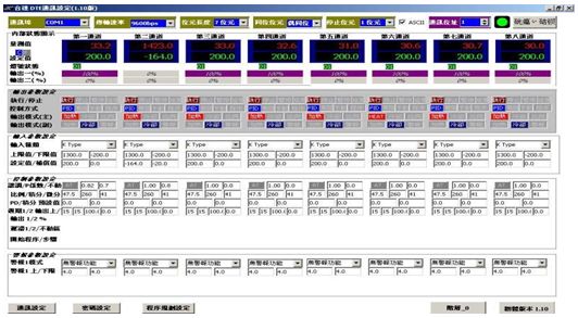 DTE對于參數(shù)的設(shè)置完全可以采用DTE專用的PC軟件來完成,全中文的DTE設(shè)置畫面簡單明了。不動區(qū)等參數(shù)需要結(jié)合現(xiàn)場實際工況來分析與設(shè)定。塑料擠出機一般可設(shè)置在:0.~2之間,而PID參數(shù)可以借助AT自動完成。