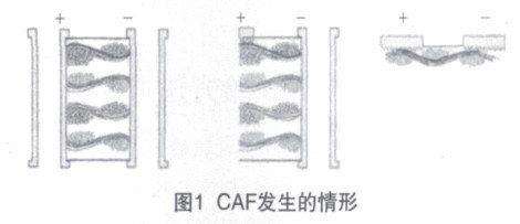 電子產(chǎn)品使用過(guò)程中性能是否穩(wěn)定涉及印制板的使用質(zhì)量。使用中常遇見(jiàn)印制板的缺陷有:離子遷移(CAF)和焊點(diǎn)質(zhì)量(Joint)等。銅離子遷移系透過(guò)玻纖紗束或紗束與樹(shù)脂之細(xì)縫,造成兩導(dǎo)體例如(孔壁到孔壁)間出現(xiàn)金屬銅的遷移,其產(chǎn)生機(jī)理是:印制板通電后由于電位差,高壓極(陽(yáng)極)銅金屬在水氣中首先出現(xiàn)腐蝕而氧化成銅Cu2+,于是銅離子會(huì)沿著通道緩緩向另一端低壓極進(jìn)行遷移,同時(shí),低壓端也會(huì)往陽(yáng)極移動(dòng),于是兩者在通道途中遭遇后即可還原出金屬銅,形成兩地間的連通即漏電短路,一旦出現(xiàn)短路,電阻頗高的發(fā)熱將CAF燒斷,爾后又開(kāi)始新的CAF。這樣周而復(fù)始發(fā)生,造成電子產(chǎn)品功能時(shí)有時(shí)無(wú)。如下圖CAF發(fā)生的幾種情形。