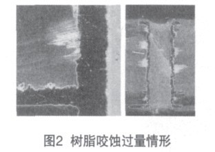 可見(jiàn),產(chǎn)生CAF必須具備下列五種條件:裸露的銅導(dǎo)體、水氣、電解質(zhì)、電位差和通道。前四項(xiàng)在電子產(chǎn)品的使用中不可避免。通道是唯一可控制產(chǎn)生CAF的途徑,而通道的形成主要與印制板的生產(chǎn)過(guò)程中材料、鉆孔、去沾污等因素相關(guān)。一般地來(lái)說(shuō)材料的玻纖越細(xì),樹(shù)脂含量越高,韌性越好,鉆孔撕裂的機(jī)率較低,因此,對(duì)于高密度的印制板或潮濕環(huán)境中使用的印制板盡可能采用細(xì)玻纖的材料。不同的材質(zhì)的鉆頭,不同鉆孔數(shù)量,不同的鉆孔參數(shù),鉆孔時(shí),鉆頭對(duì)增強(qiáng)材料的沖擊不同,孔壁質(zhì)量的差異較大,對(duì)孔壁的損傷也不盡一致,芯吸程度不一。因此,為了杜絕通道的發(fā)生,應(yīng)當(dāng)嚴(yán)格控制鉆孔質(zhì)量,確保孔壁光滑平整。去沾污主要目的是去除內(nèi)層導(dǎo)體鉆孔時(shí)吸附樹(shù)脂,當(dāng)然,也咬蝕孔壁絕緣層中的樹(shù)脂,有時(shí)為了形成負(fù)凹蝕,孔壁絕緣層樹(shù)脂甚至咬蝕更多。這時(shí),咬蝕量需嚴(yán)格控制。否則,極易形成“通道” 。如下圖樹(shù)脂咬蝕過(guò)量情形。