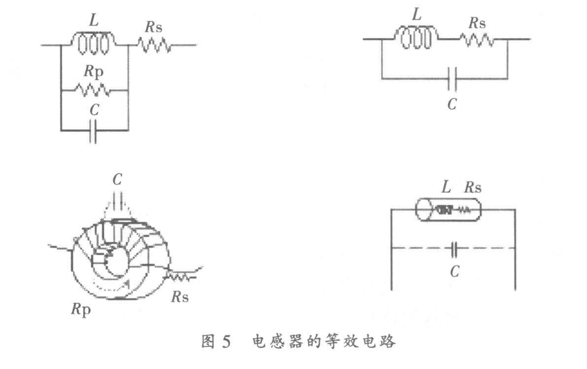 電感器由纏繞在磁芯上的導(dǎo)線構(gòu)成, 其特性則由所使用的磁芯材料決定。空氣是構(gòu)成電感器最簡(jiǎn)單的磁性材料, 但為使電感器具有更高的電感量,經(jīng)常用鐵、鐵氧體等磁性材料做磁芯。電感器的典型等效電路如圖5 (a) 所示, 圖中Rp 代表磁性的鐵耗, Rs 代表導(dǎo)線的銅耗, C 是繞線間的分布電容。對(duì)于低值電感應(yīng)使用圖5 (b) 所示的等效電路。由于L 值很小, 繞組間的分布電容就成了主要的影響因素。