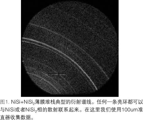 第一代應(yīng)用于多晶材料的XRD量測(cè)設(shè)備由HyperNex Inc和IBM共同研發(fā),并安裝在IBM位于紐約East Fishkill的半導(dǎo)體研發(fā)生產(chǎn)工廠。該設(shè)備的硬件設(shè)計(jì)極具針對(duì)性,它包括固定的放射源和探測(cè)器,可以在xy水平方向移動(dòng),在方位角方向旋轉(zhuǎn)的水平采樣載物臺(tái)。水平載物臺(tái)需要與硅片的傳送機(jī)械臂兼容,而xy傳送載物臺(tái)允許全硅片映射,它的重要性在隨后的章節(jié)中會(huì)變得顯而易見。X射線束使用可變的縫狀源,從而使得光束采樣可以覆蓋從50um到1mm的范圍。寬光束用來掃描無圖形的硅片,窄光束用來獲得有圖形硅片上獨(dú)立結(jié)構(gòu)的衍射譜線。描述獨(dú)立結(jié)構(gòu)特性的需求決定了系統(tǒng)必須具備視頻顯微鏡和圖形識(shí)別軟件。為了滿足高速產(chǎn)出的需要,二維場(chǎng)探測(cè)儀被用來收集衍射譜線。圖1說明了一幅探測(cè)儀收集到的衍射譜線。將場(chǎng)探測(cè)儀收集的圖形組合起來便是傳統(tǒng)的衍射圖形(圖2),它可以用作相鑒定和多相薄膜中相數(shù)的量化,圖形中根據(jù)環(huán)強(qiáng)度的變化可以獲得該材料晶體織構(gòu)的信息,環(huán)的寬度決定了相關(guān)晶粒的大小。