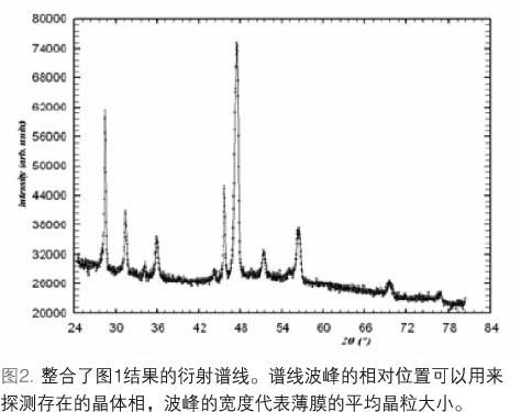 相分析要求事先了解感興趣的相。一種自動(dòng)化的峰擬合算法用來獲得曲線中每一個(gè)峰的位置和強(qiáng)度值。將實(shí)驗(yàn)峰值的位置與感興趣相的譜線作對(duì)比,來確定該相是否存在。另外,曲線中不能被匹配的峰意味著更多的相存在。例如在圖2中,如果取樣程式認(rèn)為在測(cè)量的硅片上只存在鎳單硅化物,盡管事實(shí)上相的鑒定需要手工完成,但多余的峰(來自于NiSi2)仍然會(huì)被軟件標(biāo)記。為了測(cè)量不同相的比例,一種針對(duì)多相系統(tǒng)的應(yīng)用遵循了這樣的原理,即一個(gè)獨(dú)立相衍射峰的強(qiáng)度(一級(jí)近似)與薄膜中對(duì)應(yīng)相的數(shù)量成比例。