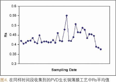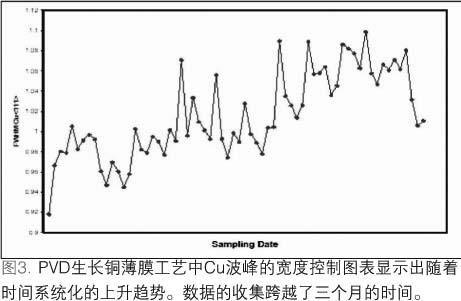 這種設(shè)備最初的一種應(yīng)用是監(jiān)測(cè)一系列物理氣相淀積(PVD)的反應(yīng)腔,這些反應(yīng)腔在銅互連金屬化制程中被用來淀積TaN/Ta/Cu襯墊層和籽晶層。這種監(jiān)測(cè)作為標(biāo)準(zhǔn)的平面電阻,膜厚量測(cè)的補(bǔ)充而存在。薄膜堆棧中Ta和Cu成分的織構(gòu)強(qiáng)度和譜線展寬數(shù)據(jù)都需要收集。TaN層具有無定形結(jié)構(gòu),因此無法監(jiān)測(cè)。圖3說明了一個(gè)從銅元素峰寬控制圖表中輸出的例子。數(shù)據(jù)的趨勢(shì)穩(wěn)步向上,表明PVD銅籽晶的平均晶粒大小隨著時(shí)間在減小。圖4說明了在相應(yīng)的Rs圖表中類似但并不十分顯著的增加。隨后的設(shè)備診斷發(fā)現(xiàn)受影響的反應(yīng)腔一個(gè)閥門有空氣泄漏的現(xiàn)象。泄漏影響到濺射工藝,進(jìn)而影響銅籽晶層的淀積,這一過程極有可能是在淀積和淀積之后的自退火過程中,由于銅在Ta表面的遷移率下降造成。更換了閥門之后,Rs和銅元素峰寬的值都變小,我們從圖3和圖4控制圖表中的最后三個(gè)數(shù)據(jù)點(diǎn)可以看出。