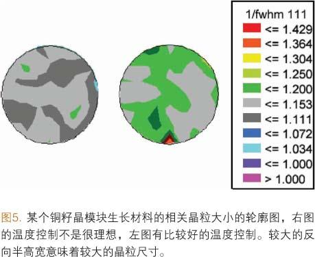 這里舉一個(gè)問題診斷的例子,它是因?yàn)椴涣嫉臏囟瓤刂茖?dǎo)致某銅籽晶模塊生長(zhǎng)的材料晶粒尺寸產(chǎn)生偏移。通過對(duì)該模塊生長(zhǎng)的銅作日常的平板電阻和膜厚監(jiān)測(cè),并沒有發(fā)現(xiàn)任何異常,但線上的XRD系統(tǒng)顯示相關(guān)的晶粒尺寸有偏移(反向半高寬FWHM)。圖5說明了某個(gè)銅籽晶模塊生長(zhǎng)材料的相關(guān)晶粒大小的輪廓圖,右圖的溫度控制不是很理想,左圖有比較好的溫度控制。較大的反向半高寬意味著較大的晶粒尺寸。