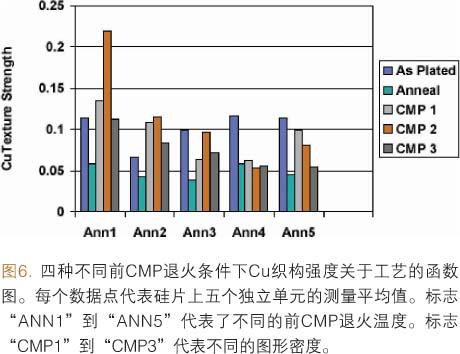 硅片在制程中的三個(gè)不同步驟進(jìn)行測(cè)量:電鍍之后,前CMP退火之后,金屬化之后。圖6說明了在M1測(cè)得的銅織構(gòu)強(qiáng)度的結(jié)果。我們將最終結(jié)果作了平均,因?yàn)闆]有觀察到銅微結(jié)構(gòu)在硅片中央和邊緣有任何不同。從數(shù)據(jù)中可以看出很多趨勢(shì),但應(yīng)該強(qiáng)調(diào)的是,微結(jié)構(gòu)的數(shù)據(jù)可以與其他線上量測(cè)的結(jié)果直接聯(lián)系起來,特別是硅片的良率。所有的結(jié)果綜合起來,可以選擇出該技術(shù)節(jié)點(diǎn)比較優(yōu)化的前CMP退火條件。