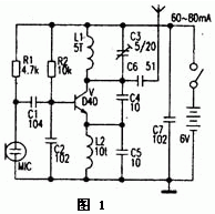 圖1是較為經(jīng)典的1.5km單管調(diào)頻發(fā)射機電路。電路中的關(guān)鍵元件是發(fā)射三極管,多采用D40,D5O,2N3866等。工作電流為60--80mA。但以上三極管難以購到,且價格較高,假貨較多。筆者選用其他三極管實驗,相對易購的三極管C2053和C1970是相當(dāng)不錯的,實際視距通信距離大于1.5km。筆者也曾將D40管換成普通三極管8050,工作電流有60--80mA,但發(fā)射距離達(dá)不到1.5km,若改換成9018等,工作電流更小,發(fā)射距離也更短,電路中除了發(fā)射三極管以外;線圈L1和電容C3的參數(shù)選擇較重要,若選擇不當(dāng)會不起振或工作頻率超出88--108MHz范圍。其中L1,L2可用0.31mm的漆包線在3.5mm左右的圓棒上單層平繞5匝及10匝,C3選用5-20pF的瓷介或滌綸可調(diào)電容。實際制作時,電容C5可省略,L2上也可換成10-100mH的普通電感線圈。若發(fā)射距離只要幾十米,那么可將電池電壓選擇為1.5-3V,并將D40管換成廉價的9018等,耗電會更少,也可參考《電子報》2000年第8期第五版(簡易遠(yuǎn)距離無線調(diào)頻傳聲器)一文后稍作改動。圖1介紹的單管發(fā)射機具有電路簡單,輸出功率大,制作容易的特點,但是不便接高頻電纜將射頻信號送至室外的發(fā)射天線,一般是將0.7--0.9m的拉桿天線直接連在C5上作發(fā)射的,由于多普勒效應(yīng),人在天線附近移動時,頻漂現(xiàn)象很嚴(yán)重,使本來收音正常的接收機聲音失真或無聲。若將本發(fā)射機作無線話筒使用,手捏天線時,頻漂有多嚴(yán)重就可想而知了。