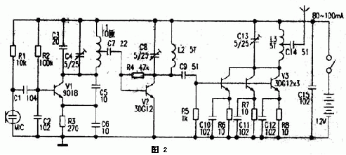 圖2為2km調(diào)頻發(fā)射機電路。本電路分為振蕩、倍頻、功率放大三級。電路中V1、C2--C6、R2、R3及L1組成電容三點式振蕩器,其振蕩頻率主要由C3、C4和L1的參數(shù)決定,其振蕩頻率為44~54MHz,該信號從L1的中心抽頭處輸出,再經(jīng)過C7耦合至V2放大,由C8和L2選出44~54MHz的二倍頻信號,即88-108MHz,,此信號由C9耦合至V3進(jìn)行功率放大,V3由3只3DGl2三極管并聯(lián)組成,可擴大輸出功率。該電路正常工作時,電流約80-100mA。組成V3的三只3DG12可加上適當(dāng)?shù)纳崞苑肋^熱。制作時L1~L3用0.31mm漆包線在直徑3.5mm圓棒上單層平繞。