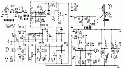 很多調(diào)頻立體聲模塊均將BAl404和外圍元件封裝在一個塑料或金屬外殼內(nèi)制成,只露出電源輸入、音頻輸入、射頻輸出引線,只要了解BAl404以后,就知道調(diào)頻立體聲模塊內(nèi)部是怎么一回事了。來自音源的立體聲音頻信號經(jīng)R1、R2、R5、C1、C3、C5(R4、R3、R6、C2、C4、C6)組成的網(wǎng)絡(luò)耦合到BAl404。經(jīng)IC內(nèi)部左(右)聲道放大,再進(jìn)行平衡調(diào)制,調(diào)制后的復(fù)合信號從IC的第14腳輸出,后與第13腳上的導(dǎo)頻信號通過B9、C15,B10、C16、C17構(gòu)成的網(wǎng)絡(luò)進(jìn)行混頻,混頻后的復(fù)合信號進(jìn)入IC的12腳,對比的⑧、⑨、⑩腳,C20--C22及髓組成的電容三點式振蕩器進(jìn)行調(diào)頻,IC的⑩腳上已調(diào)制的射頻信號經(jīng)內(nèi)部放大后從第⑦腳輸出,經(jīng)C18、L2選頻后送至天線TXl。要實現(xiàn)調(diào)頻立體聲,BAl404的⑤、⑥腳需外接38kHz晶體,但業(yè)余制作時的確很難購得38kHz的專用晶體,所以在無該晶體的情況下,可以參考虛線內(nèi)的電路,用分立元件制作一個38kHz振蕩器,該38kHz信號經(jīng)過R8、C10送人IC第⑤腳。制作時,Ll可用收音機中頻變壓器ITF—2—1、TTF-2-2或TFF-2-9等,同時注意引腳的連接不要搞錯,③腳接地,②腳接V1的發(fā)射極,①腳為反饋和輸出腳。通過調(diào)整其磁芯可以獲得頻率較穩(wěn)定、幅度足夠高的38kHz信號。