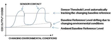 保持可靠性能。容性傳感器電極是采用PCB上的標(biāo)準(zhǔn)銅材料或柔性材料制成的。這種材料的特性會(huì)隨溫度和濕度的變化而發(fā)生改變。這種變化會(huì)使基線電平發(fā)生偏移(所有傳感器閾值電平均是以基線電平為參考的)。較大的基線偏移增加了接觸閾值電平過低或過高的風(fēng)險(xiǎn)(過低還是過高取決于基線偏移的方向)這會(huì)引起虛假的接觸誤差,或使閾值電平不是太靈敏就是不夠靈敏,導(dǎo)致接觸狀態(tài)的不穩(wěn)定。為保持傳感器原始的信號(hào)接觸閾值檢測電平余量(靈敏度),CDC需要自動(dòng)跟蹤基線偏移誤差的幅度,并對(duì)閾值設(shè)置進(jìn)行相應(yīng)的重新調(diào)整。圖2中的示例介紹了AD7147和AD7148的閾值電平如何針對(duì)因環(huán)境條件變化引起的基線失調(diào)變化進(jìn)行自動(dòng)跟蹤和調(diào)整。