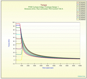 像上圖一樣的繪出一個電機的轉(zhuǎn)矩——轉(zhuǎn)速曲線并非輕而易舉之事,需要每個轉(zhuǎn)速下優(yōu)化超前角來得到。MotorSolve可以快速設置多種轉(zhuǎn)速和超前角的組合方式,來繪制上述圖形。通過這些曲線的包絡線,能得到轉(zhuǎn)矩——轉(zhuǎn)速曲線和優(yōu)化的超前角。恒功率變速內(nèi)嵌磁鋼式永磁電機的曲線如上圖所示。