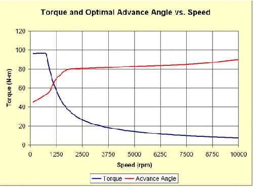 這幅圖中可以提取每個轉(zhuǎn)速下優(yōu)化超前角的峰值轉(zhuǎn)矩。當電機超過恒轉(zhuǎn)矩區(qū)域(大概875轉(zhuǎn)/分)后,弱磁的優(yōu)勢突顯出來。