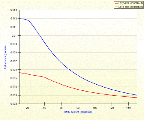 內(nèi)嵌磁鋼式永磁電機的調(diào)速范圍寬是由于其具有較高的凸極比(d軸電感與q軸電感之比)。MotorSolve能準確地描述由磁路飽和引起的電感的非線性規(guī)律。上圖表明了Ld 和Lq是電流的函數(shù)。[page]