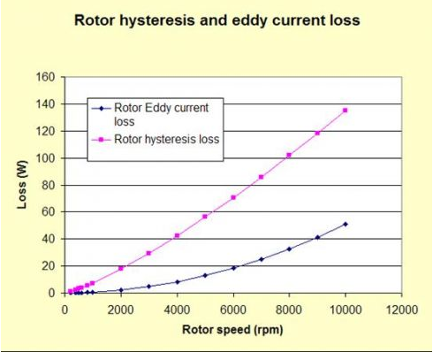銅損是電機整體損耗中關鍵的部分,MotorSolve先進的損耗計算能力能計算出基于元件級的磁滯和渦流損耗。上圖表明轉(zhuǎn)子的磁滯和渦流損耗是轉(zhuǎn)速的函數(shù)(或等價的是頻率的函數(shù))。渦流趨勢呈現(xiàn)拋物線型,而磁滯損耗與功率曲線規(guī)律相似。