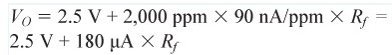 傳感器的最大響應為90 nA/ppm,如表2所示,其最大輸入范圍為2,000 ppm.因此,最大輸出電流為180 μA,最大輸出電壓由跨導電阻決定,如公式2所示。