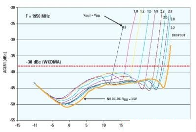 如圖3所示,為了符合鄰道功率抑制比(ACPR)的要求,DC-DC轉換器的輸出電壓必須隨著發射功率電平的變化而變化。在0d Bm到20d Bm的功率電平范圍內,電池電流可節省多達50mA。圖2表示的是功率放大器在大多數時間內,運行在這樣的功率電平范圍內。