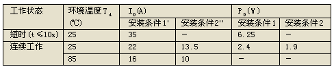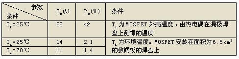 在DC/DC轉(zhuǎn)換器中,MOSFET工作在占空比變化的脈沖狀態(tài),但也不是工作于窄脈沖狀態(tài);工作溫度范圍是-40~85℃。表1、表2中無這種工作條件下的ID及PD值。ID可在下面的范圍內(nèi)選取:(TA=70~85℃時的ID)