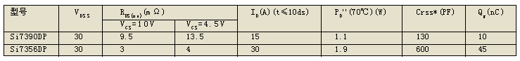 初選Vishay公司的Si7390DP作NH(其Qg僅10nC);Si7356DP作NL (RDS(on)=4mΩ)。其封裝都是8引腳、有散熱墊的SO-8封裝,主要參數(shù)如表3所示。