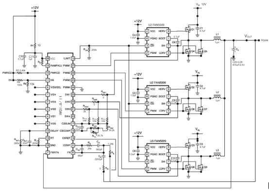 由控制器FAN5019B及3個驅(qū)動器FAN5009組成的三相同步整流降壓式DC/DC轉(zhuǎn)換器電路如圖7所示。現(xiàn)使用條件:VIN=VCC=12V(VCC是供控制器及驅(qū)動器的工作電壓),VOUT=1.5V,IO=65A(IO即IOUT(max)),fsw=228kHz,選擇開關(guān)管及同步整流管(采用兩個并聯(lián)組成)。