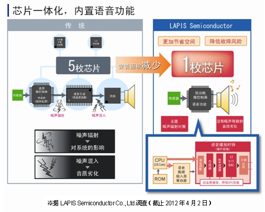 此產(chǎn)品不僅集成了微控制器、語音功能、功放,LAPIS Semiconductor Co., Ltd.還將控制IGBT的PWM電路、LCD驅(qū)動(dòng)器等家用電器所需的外圍功能都集于一枚芯片,使待機(jī)時(shí)的耗電量更低。