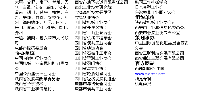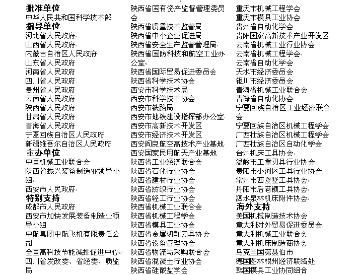 ●巡回推介會:組委會安排專人前往包括省內(nèi)的寶雞、漢中、咸陽、延安、榆林、安康、渭南、銅川、商洛及鄰近省份山西、河南、湖北、甘肅、青海、寧夏、內(nèi)蒙、新彊等省的重點城市及重慶、貴州、云南、廣西、廣東、上海、北京以及浙江、山東、江蘇等省區(qū)重點裝備制造工業(yè)城市巡回推介宣傳本屆博覽會。