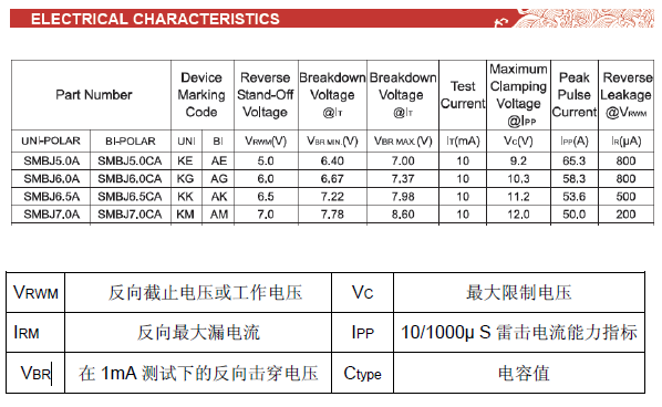 • VRWM :截止電壓必須大于被保護的電路的最大工作電壓