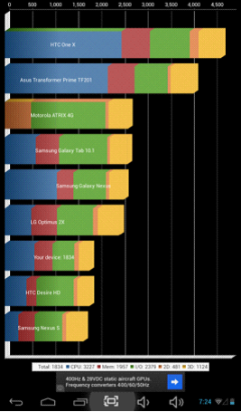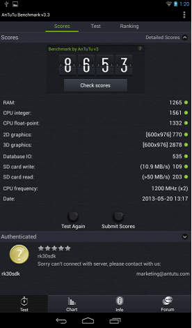 具有600MHz主頻SGX PVR540 GPU的RK3168在此項測試上遠遠拋離A20的Mail 400 @350Mhz,充分體現(xiàn)了兩者在GPU性能上的巨大差距。目前GPU性能對于平板來說是僅次于CPU的重要指標,很大程度上決定了整機在運行大型游戲、播放在線視頻等方面的體驗,對消費者來說是非常重要的考慮因素。