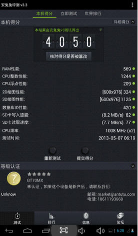 AnTuTu Benchmark是一個專門給Android設備的手機、平板電腦硬體打分的軟件,,通過“內存性能”、“CPU整數(shù)性能”,“CPU浮點性能”、“2D、3D繪圖性能”、“數(shù)據(jù)庫IO”、“SD卡讀、寫速度” 等性能測試對手機的硬體性能做出評分。