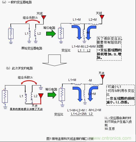 為了削減這種阻抗成分并維持變壓比,我們采用了圖1所示的高頻變壓器的構造。該構造跟普通的變壓器構造相反,它將接地連接端口跟天線連接端口完全逆反。因此,才能達到如圖1所示的變壓比。使用該構造的話,因結合產(chǎn)生的互感M值會反應到變壓器,變壓器中使用的線圈L值會減小,由于高頻變壓器的阻抗成分I.L.可以被抑制得很小。