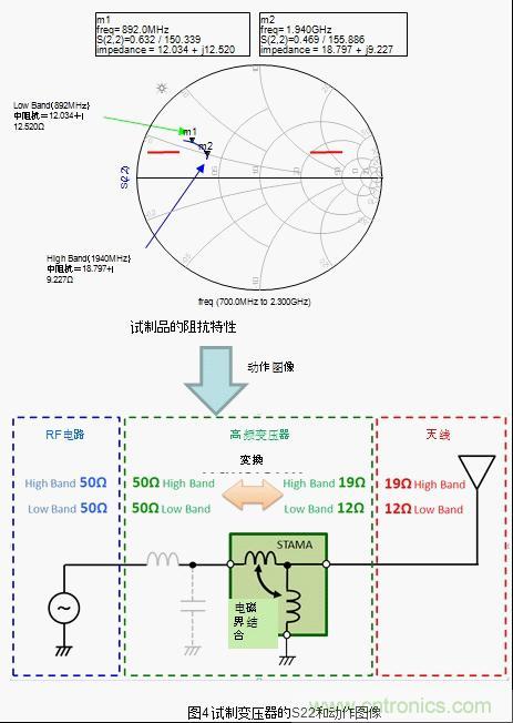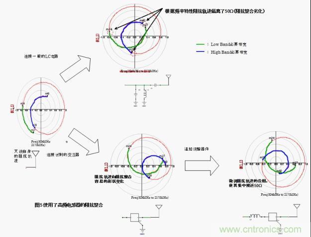 將普通的LC電路跟天線連接,根據(jù)頻率特性的不同在廣帶寬情況下阻抗整合會變得困難。針對該情況,將本次試制的高頻變壓器跟天線連接,low band和high band都轉換成了最合適的阻抗。也就是說,工匠圖上的阻抗軌跡有可能變化成阻抗整合容易的形狀。之后通過外部的調(diào)節(jié)元件將阻抗軌跡的相位進行微調(diào),有可能非常容易的就集中在50Ω附近了。(圖5)