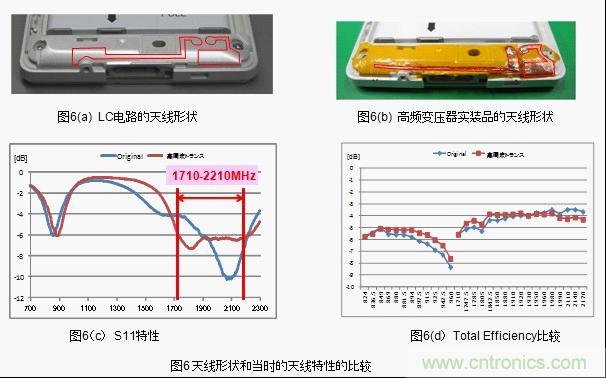結果顯示,low band 情況下LC電路和高頻變壓器都不可能達到「S11<-6dB」(反射損耗1.2dB)。而high band情況下,達到「S11<-6dB」范圍的,如果使用LC電路的話是300MHz,而使用高頻變壓器的話則是500MHz,達到了66%的改善效果。(圖6(c)) 。此外,LC電路和高頻變壓器中天線的綜合特性顯示「Total Efficiency」,low band的高頻側也得到了0.6dB的改善效果。(圖6(d))。這種改善效果正是由于帶寬的廣帶寬化和I.L.得到了改善。