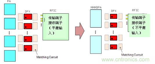 移動(dòng)終端的前端部分搭載的電子元器件隨著通信功能的混載和搭載頻帶數(shù)量的增加,正在日漸小型化。在構(gòu)成無(wú)線通信設(shè)備的同時(shí),RF收發(fā)器IC(RFIC;射頻集成電路)是必備的元器件。RFIC具有變化電波頻率、調(diào)節(jié)和調(diào)整信號(hào)功能。RFIC的接收端輸入端子的趨勢(shì)是由平衡輸入轉(zhuǎn)化成不平衡輸入,通過(guò)實(shí)現(xiàn)不平衡輸入的信號(hào)處理來(lái)達(dá)到削減RFIC端子數(shù)量的小型化目的。另外,PA的信號(hào)強(qiáng)度增加,采用了MMMB(多模多頻段)PA。如果只用對(duì)應(yīng)一個(gè)頻帶的PA構(gòu)成的話,那只搭載頻帶數(shù)的PA就變得非常必要了,MMMBPA對(duì)應(yīng)的是多波段,一個(gè)元器件就能覆蓋多個(gè)的頻帶。如果使用這個(gè)的話,可以通過(guò)減少元器件個(gè)數(shù)來(lái)實(shí)現(xiàn)縮小搭載面積的目的。電感器、電容這種匹配的元件也不例外,可以推進(jìn)從0603尺寸(0.6×0.3mm)到0402尺寸(0.4×0.2mm)的小型化。