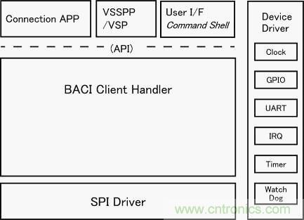 BACI通過簡化與主機之間的通信來降低訪問頻率。而且,在結構設計上采用通過事件使主機啟動的結構,因此,是盡可能使主機停動來抑制耗電量的設計。綜上所述,本LSI在整個結構模塊上進行了降低耗電量的設計,從而,使紐扣電池驅動3年以上連續工作成為可能。主機和堆棧結構如圖2所示。