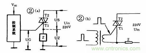 改進此電路的方法之一是,采用觸發變壓器隔離控制系統的參考點(如圖2b), 觸發信號可以由BT33組成鋸齒波發生器受控于控制系統(矩形波也可以),這樣,不受初級參考點的影響,觸發變壓器次級可直接接在G與T1之間,與負載上電壓無關。