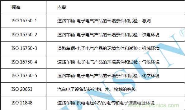 ISO 16750 系列標準是國際標準化組織ISO 最近幾年推出的針對汽車電子的環境可靠性標準,該標準是歐系車常用的標準,并且逐漸被世界各國轉化為國家標準,也逐漸被各企業標準所引用,成為應用比較廣泛的汽車電子的環境可靠性標準。該系列標準包括五個部分: