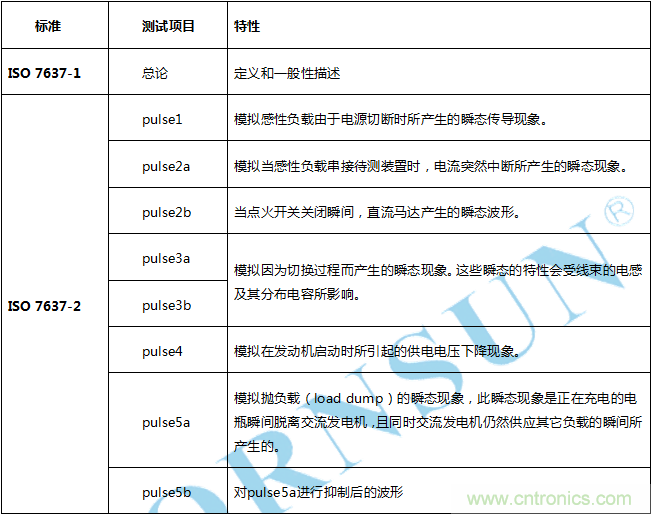 針對汽車電子自身產生的干擾,國際無線電干擾委員會(CISPR)對汽車電子業提出了嚴格的要求,尤其是車載收音機、數字電視、導航設備都是這種干擾的重災區。所以 CISPR25:用于保護車載接收機的無線電騷擾特性的限值和測試方法,對汽車電子自身的發射狀態也有了明確的等級判定。EMS方面的測試項目如下所示: