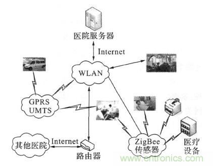 系統中包括無線個人網絡(wireless person2al area network,WPAN ) 、ZigBee網絡以及一系列醫療監護網絡的醫療傳感器節點。本系統具有良好的擴展性,例如醫護人員在急救途中或在其他醫院可以分別利用WLAN /UMTS網關和互聯網與系統進行信息交互。