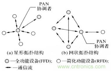 星形網絡結構的通信是以FFD作為PAN協調者完成與設備之間的通信,在該網絡中PAN協調者的功能是初始化網絡、中止和路由信息。星形網絡廣泛應用于自動化家居、個人醫療監護系統和醫院病房等小區域。