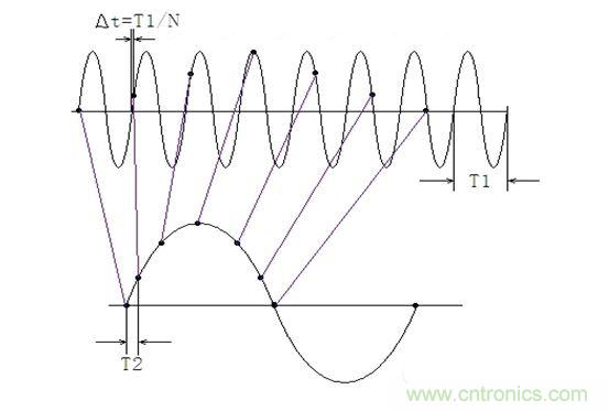 可以看到,等效采樣方法在輸入信號(hào)一個(gè)周期內(nèi)僅采樣一個(gè)點(diǎn)且每個(gè)周期采樣的相位有遞增關(guān)系(圖1中△t),調(diào)整這個(gè)遞增相位可以達(dá)到調(diào)整相位分辨率的目的。