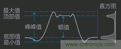 2.自動測量,當示波器正確捕獲波形后,示波器可以對波形參數(shù)進行自動測量。自動測量需要參考點,一般稱為Vtop(頂部值) 和Vbase(底部值),參考點的測量采用幅度統(tǒng)計方法。示波器的工作過程是對捕獲波形進行的幅度分析,先確定最大值Max和最小值Min,然后對最小電壓上的40%和最大電壓下的40%進行分析,然后進行累積概率統(tǒng)計,出現(xiàn)概率最大的值為Vtop 和Vbase。不用統(tǒng)計中間20%部分,防止被測波形是3態(tài)信號得出錯誤結果。