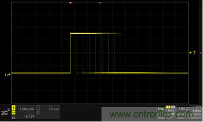 對于周期性的波形信號來說,自動測量相對于光標測量來說,統(tǒng)計的數(shù)據(jù)量多,測量結果為統(tǒng)計數(shù)據(jù)的平均值,相對來說更加準確。但是如果信號噪聲很大,自動測量則有可能將噪聲也統(tǒng)計進去,所得結果也會有較大誤差。自動測量項目一般為常規(guī)項目,當有特殊需求時,自動測量便無能為力了,比如測量下圖抖動波形。