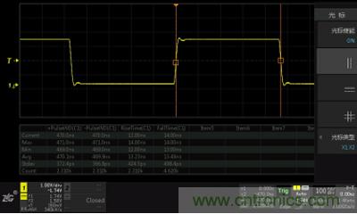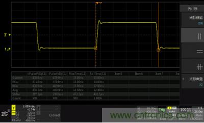 為什么會出現(xiàn)這種情況呢?示波器自動測量的門限是為Vtop與Vbase之間50%的位置,所以測量的結果也是以50%處為準,這種測量方法也更為科學。在用光標測量時,如果將測量點選在Vtop與Vbase的50%處,這樣測出的結果便和自動測量結果相差無幾了。如下圖,光標測量470ns,自動測量470.1ns。