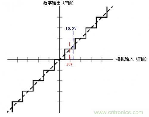 出現這種情況的原因首先是由測量設備內部的ADC產生的量化誤差引起的,假設測量設備內部包含一個11位的ADC,ADC共有211=2048個有效位,在1000V的量程(峰峰值)下,考慮最大±1000V的輸入共2048個有效位,則由于不可避免的噪聲的影響,ADC每跳動一個最小單位1LSB,產生的量化誤差大約會有2000V/2048≈1V。如果使用該量程測量10.3V這樣的信號,很顯然單次ADC取樣的最小分辨率已無法識別0.3V這樣刻度(在圖 2的量化示意圖中0.3V處在兩個刻度中間),當然無法測得正確的值。如果無規則噪聲的峰值能大于1LSB時,多次采樣取平均值后可以提高測量系統的有效位數,但這樣的因素不在我們考慮的范圍之內。
