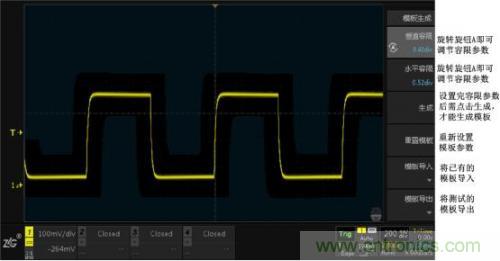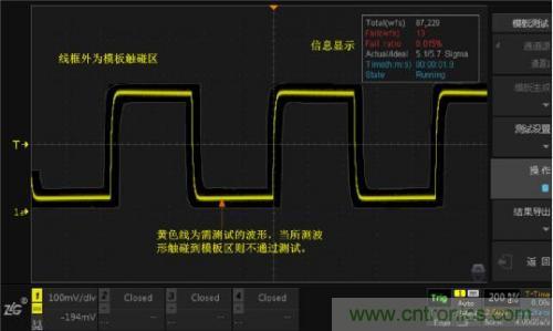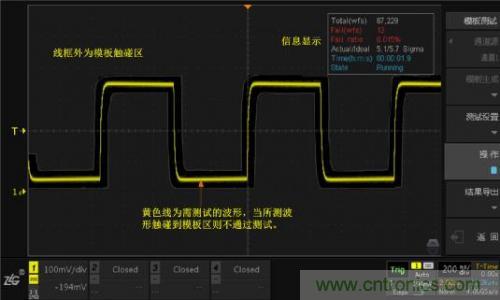 上圖就是模板測(cè)試的測(cè)試界面,其中,線(xiàn)框外為模板觸碰區(qū),波形接觸到該區(qū)域會(huì)被判定為不合格波形,即“Fail”。沒(méi)有接觸到模板觸碰區(qū)的波形為“Pass”。右上角顯示信息是模板測(cè)試中的一些狀態(tài)信息。